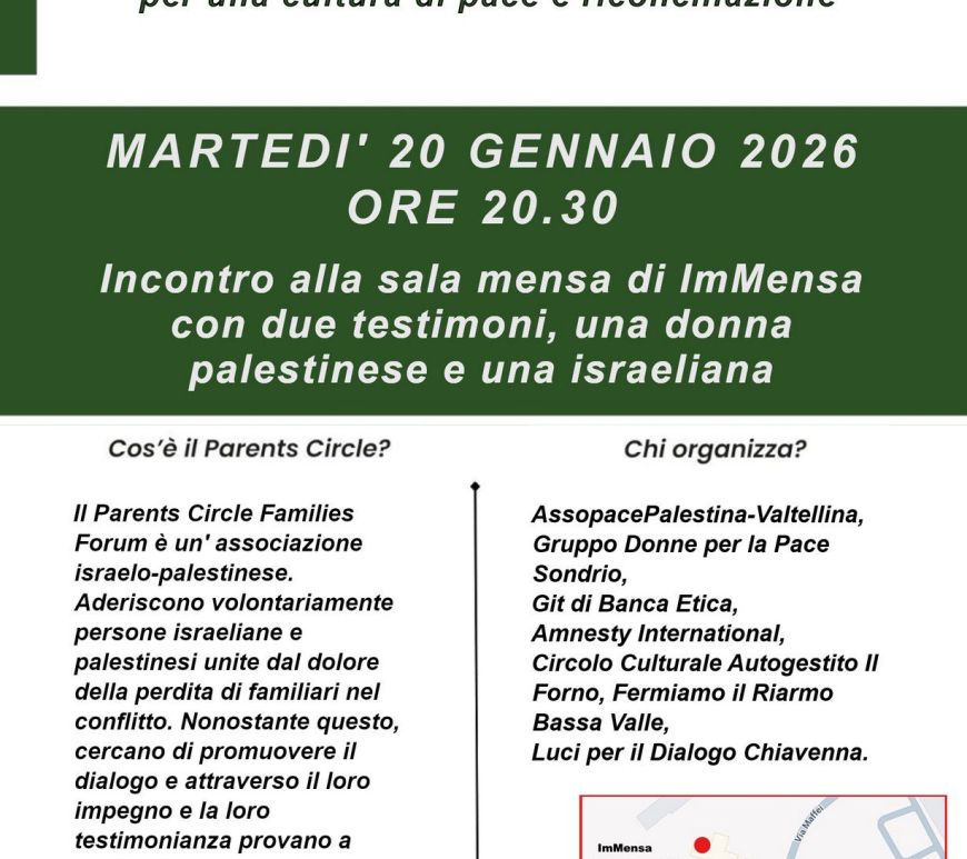 Promuovono Luci per il Dialogo – Chiavenna, Assopace Palestina – Sondrio, Gruppo Donne per la Pace Sondrio, Banca Etica – Soci della Provincia di SondrioAmnesty International Morbegno e Circolo Culturale Autogestito Il Forno sulla scia di precedenti incontri, a settembre 2025 con due rappresentanti di Combattenti per la Pace e a dicembre 2025 con due refusenik israeliani, entrambi esempi di co-resistenza nella attuale drammatica situazione a Gaza e in Cisgiordania.