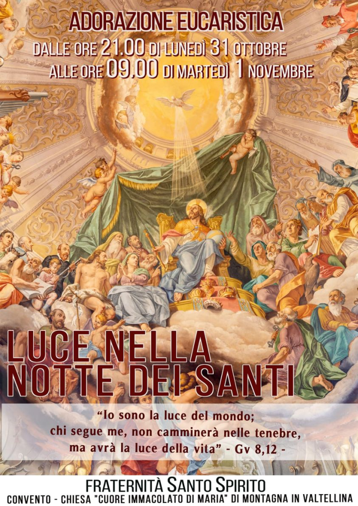 Si svolgerà nella notte tra le ore 21.00 di lunedì 31 ottobre fino alle ore 9.00 di martedì 1 novembre l’adorazione eucaristica “Luce nella notte dei Santi” presso la chiesa del convento di Colda – Montagna in Valtellina guidato dalla Fraternità Santo Spirito.