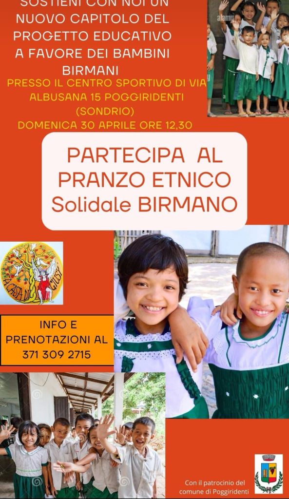 Domenica 30 aprile alle ore 12.30 presso il centro sportivo di via Albusana a Poggiridenti si terrà un pranzo etnico solidale con piatti della tradizione birmana organizzato dall’associazione “La Casa di Giusy”. Il ricavato contribuirà a finanziare progetti educativi in Birmania. Informazioni e prenotazioni al 3713092715.