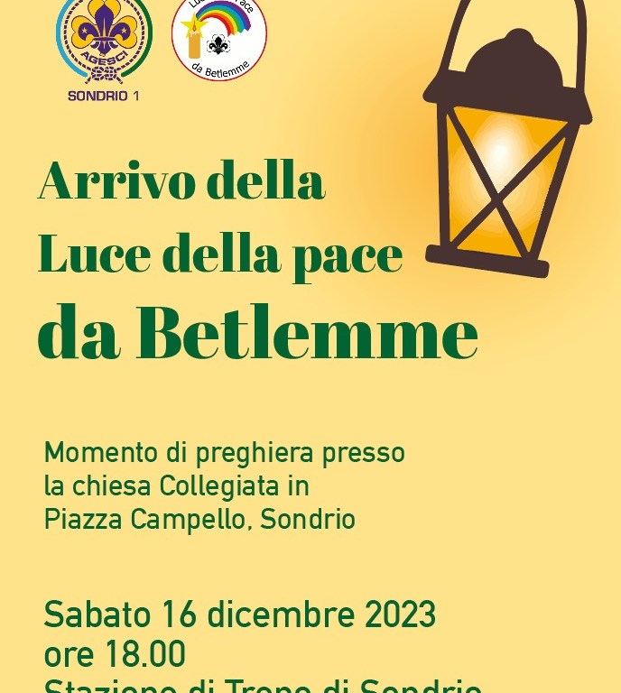 Il gruppo scout di Sondrio organizza sabato 16 dicembre 2023 l’accoglienza della Luce della pace proveniente da Betlemme. L’appuntamento è alle ore ore 18 presso la Stazione ferroviaria di Sondrio in p.le Bertacchi.