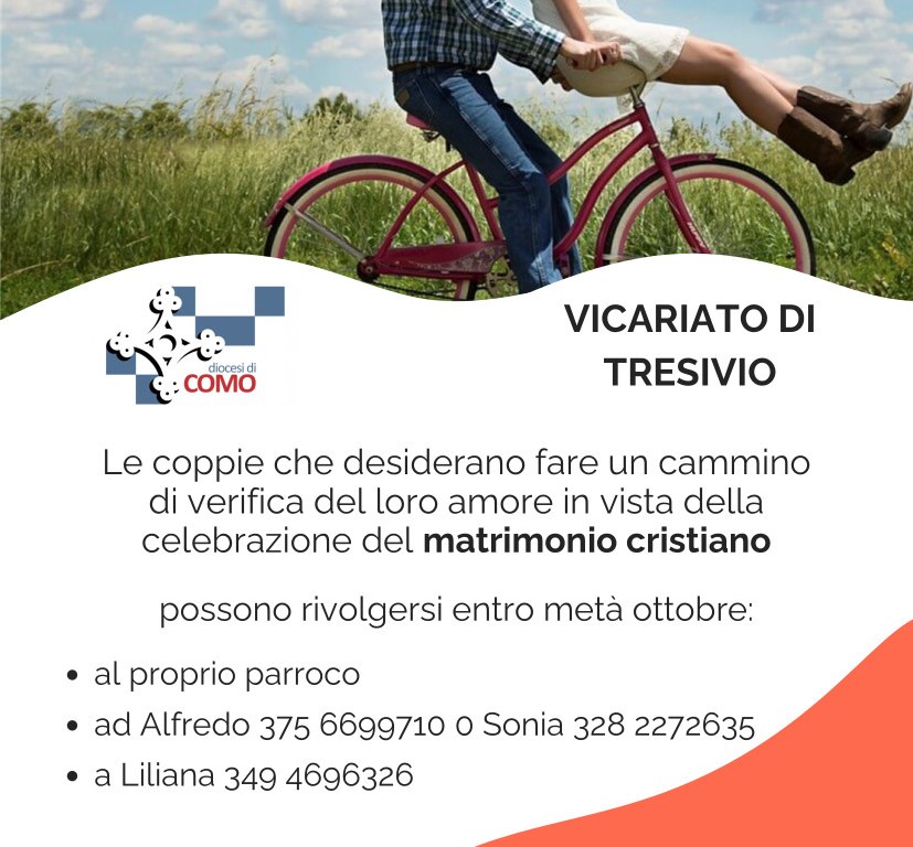 Il Vicariato di Tresivio organizza il corso di preparazione al Sacramento del Matrimonio dal titolo “Per Sempre”. Le coppie che desiderano fare un cammino di verifica del loro amore in vista della celebrazione del matrimonio cristiano possono rivolgersi entro metà ottobre al proprio parroco oppure ad Alfredo 3756699710, Sonia 3282272635 o a Liliana 3494696326.