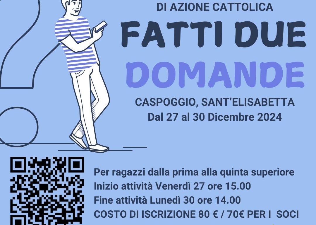 Dal 27 al 30 dicembre si svolgerà presso la Casa di Caspoggio, loc. Santa Elisabetta il campo invernale giovanissimi di Azione Cattolica dal titolo “fatti due domande”. Per ragazzi dalla prima alla quinta superiore. Le altre informazione in locandina.