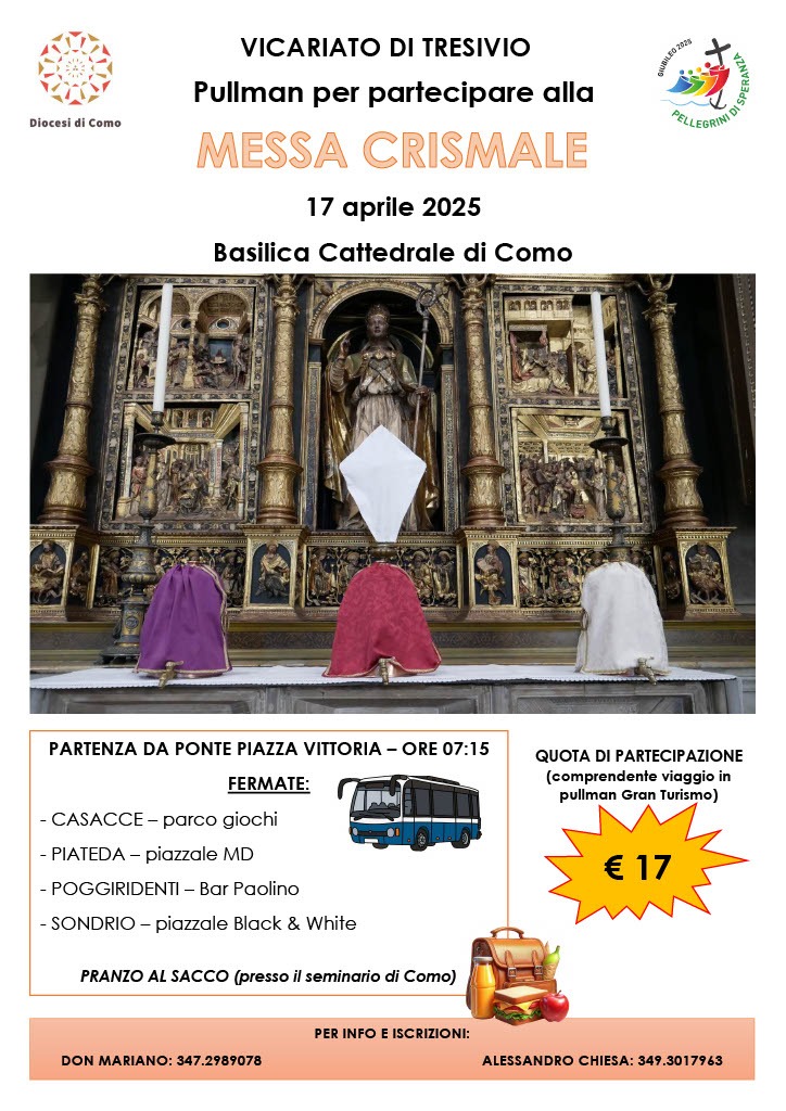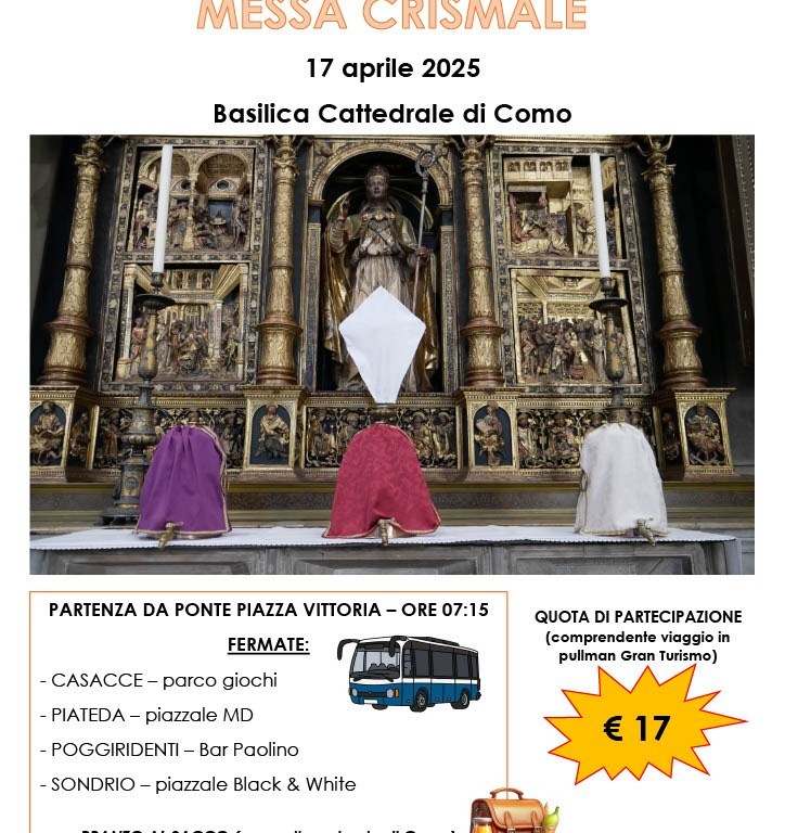 In occasione della Messa crismale che si celebrerà giovedì santo 17 aprile 2025 presso la Cattedrale a Como, il vicariato di Tresivio organizza il viaggio in pullman con pranzo al sacco al seminario vescovile,