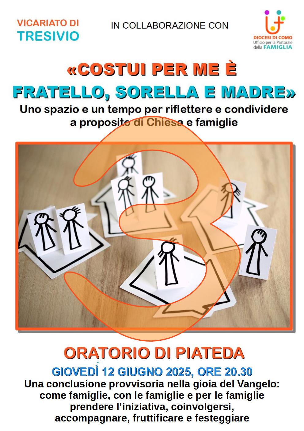 Il Vicariato di Tresivio, in collaborazione con l’ufficio diocesano per la pastorale della famiglia, propone il terzo incontro di riflessione e condivisione su Chiesa e famiglie in questo tempo, dal titolo «Costui per me è fratello, «Costui per me è fratello, sorella e madre sorella e madre».