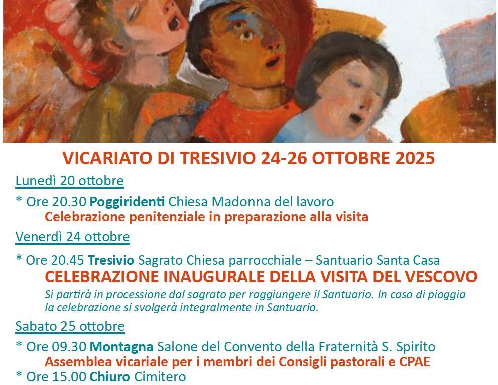 Raccomandiamo in particolare la partecipazione alla celebrazione di apertura (a Tresivio, venerdì 24/10 alle 20.30) e alla Messa finale (Sazzo, domenica 26/10 ore 10.00). Programma completo in locandina. Nelle parrocchie saranno soppresse le Messe della domenica mattina, mentre quelle vespertine del sabato 25 ottobre e, se presenti, quella del pomeriggio di domenica 26 ottobre saranno celebrate.