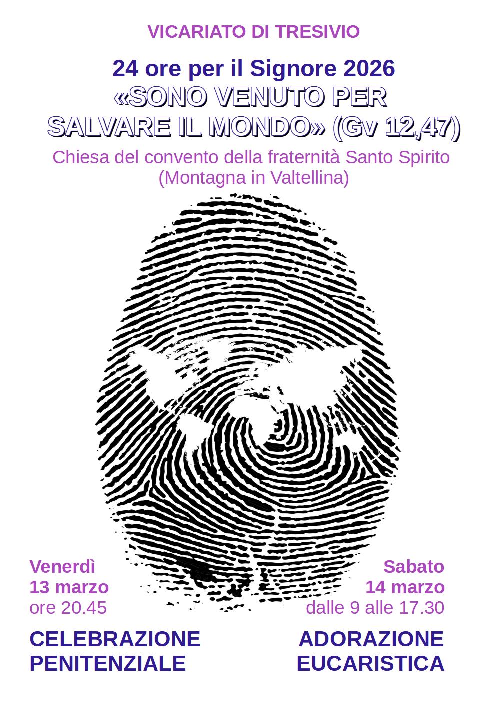 Nell’ambito delle “24 ore per il Signore”, il Vicariato di Tresivio propone presso la chiesa del convento di Montagna in Valtellina, venerdì 13 marzo alle 20.45 una celebrazione penitenziale, dove vivere il sacramento della penitenza anche in vista della S. Pasqua (grazie ai tanti confessori presenti), sabato 14 un periodo prolungato di adorazione dove l’Eucarestia sarà esposta dalle ore 9 alle 17,30 grazie all’animazione delle comunità parrocchiali e della Fraternità Santo Spirito. Sarà presente un confessore.
