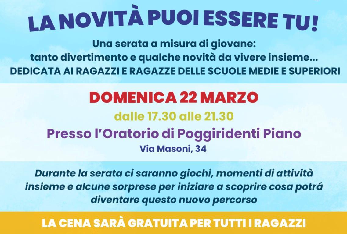 Nei nostri paesi sta iniziando un nuovo progetto che riguarda gli oratori e soprattutto i ragazzi: si chiama Oratorio 6+. Per iniziare questo cammino abbiamo pensato a una prima serata speciale dedicata a tutti i ragazzi. Quando: 22 marzo, dalle 17.30 alle 21.30. Dove: Oratorio Poggiridenti Piano. Cosa: Una serata a misura di giovane… tanto divertimento e qualche novità da vivere insieme. Per chi: Ragazzi e ragazze delle scuole medie e superiori. Durante la serata ci saranno giochi, momenti di attività insieme e alcune sorprese per iniziare a scoprire cosa potrà diventare questo nuovo percorso. La cena sarà gratuita per tutti i ragazzi.