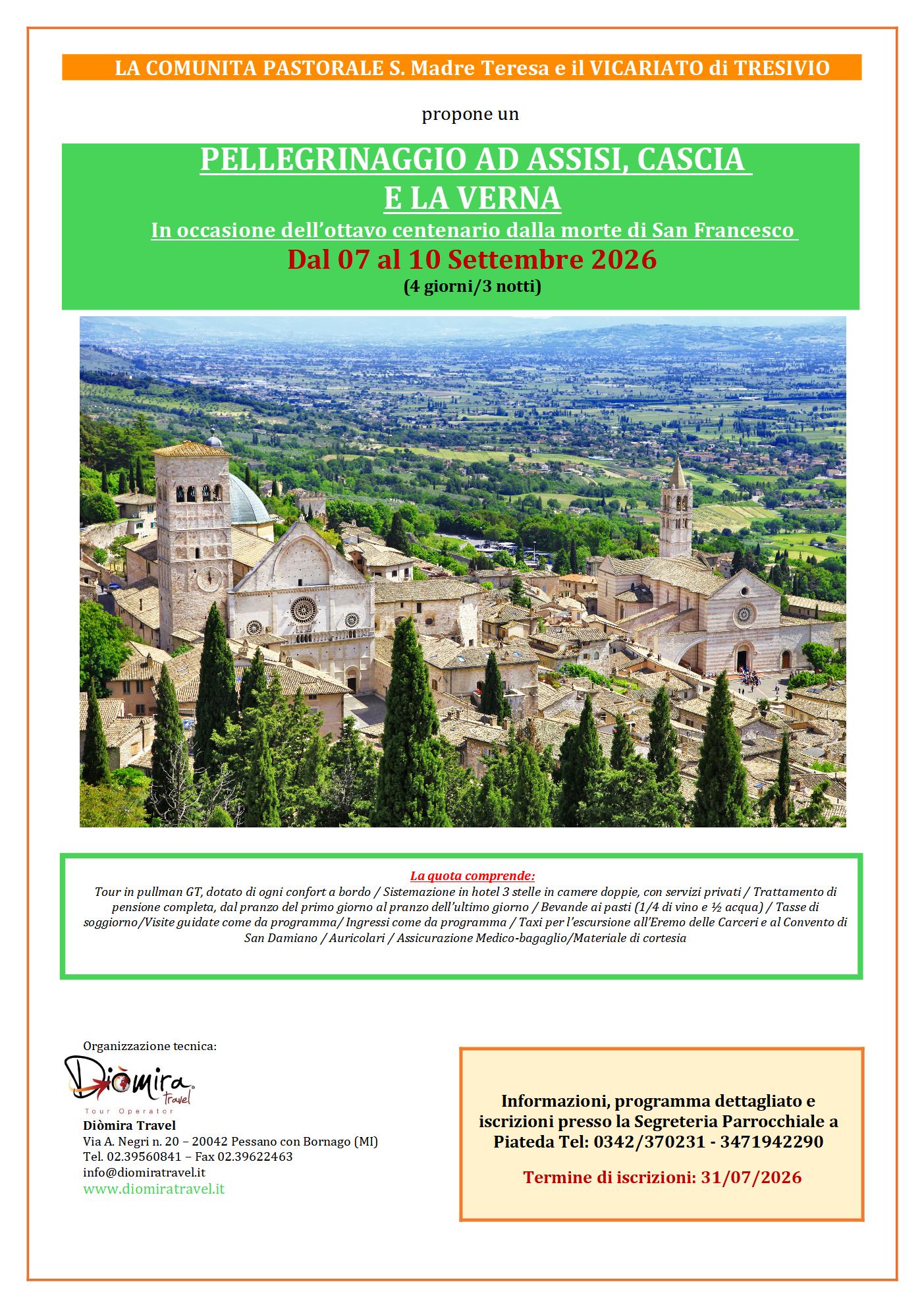 In occasione dell’ottavo centenario dalla morte di San Francesco, la Comunità pastorale S. Teresa di Calcutta (Boffetto, Piateda, Faedo-Busteggia) in collaborazione con il Vicariato di Tresivio organizza un pellegrinaggio ad Assisi, Cascia e La Verna dal 7 al 10 settembre 2026 (4 giorni e 3 notti).