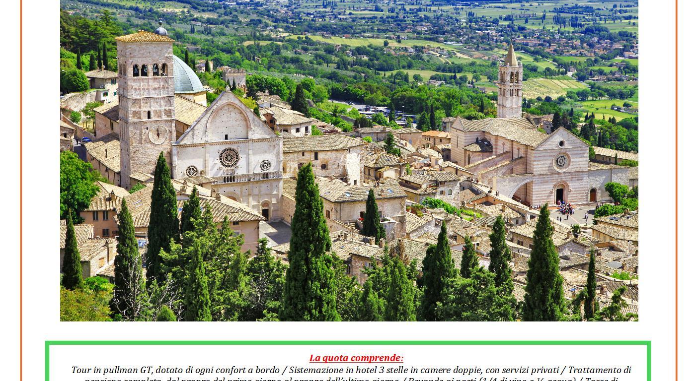 Tour in pullman GT, dotato di ogni confort a bordo / Sistemazione in hotel 3 stelle in camere doppie, con servizi privati / Trattamento di pensione completa, dal pranzo del primo giorno al pranzo dell’ultimo giorno / Bevande ai pasti (1/4 di vino e ½ acqua) / Tasse di soggiorno/Visite guidate come da programma/ Ingressi come da programma / Taxi per l’escursione all’Eremo delle Carceri e al Convento di San Damiano / Auricolari / Assicurazione Medico-bagaglio/Materiale di cortesia.