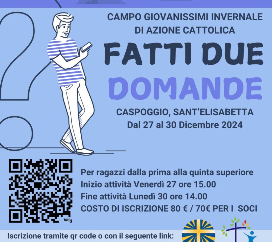 Dal 27 al 30 dicembre si svolgerà presso la Casa di Caspoggio, loc. Santa Elisabetta il campo invernale giovanissimi di Azione Cattolica dal titolo “fatti due domande”. Per ragazzi dalla prima alla quinta superiore. Le altre informazione in locandina.